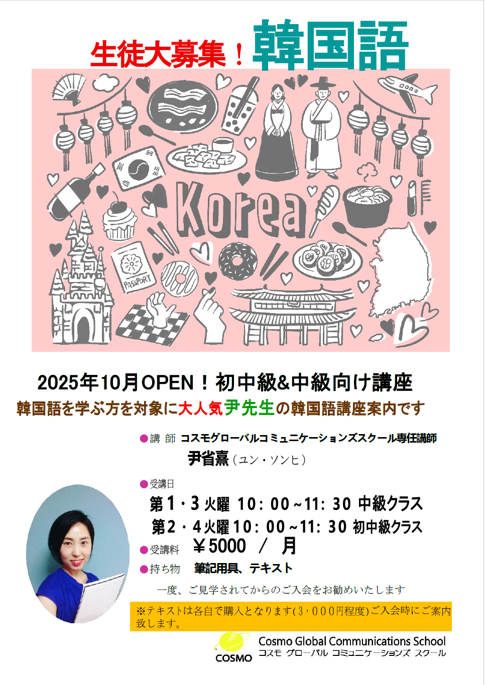 2025年10月から開講している、大人気講師 尹先生による韓国語講座です。